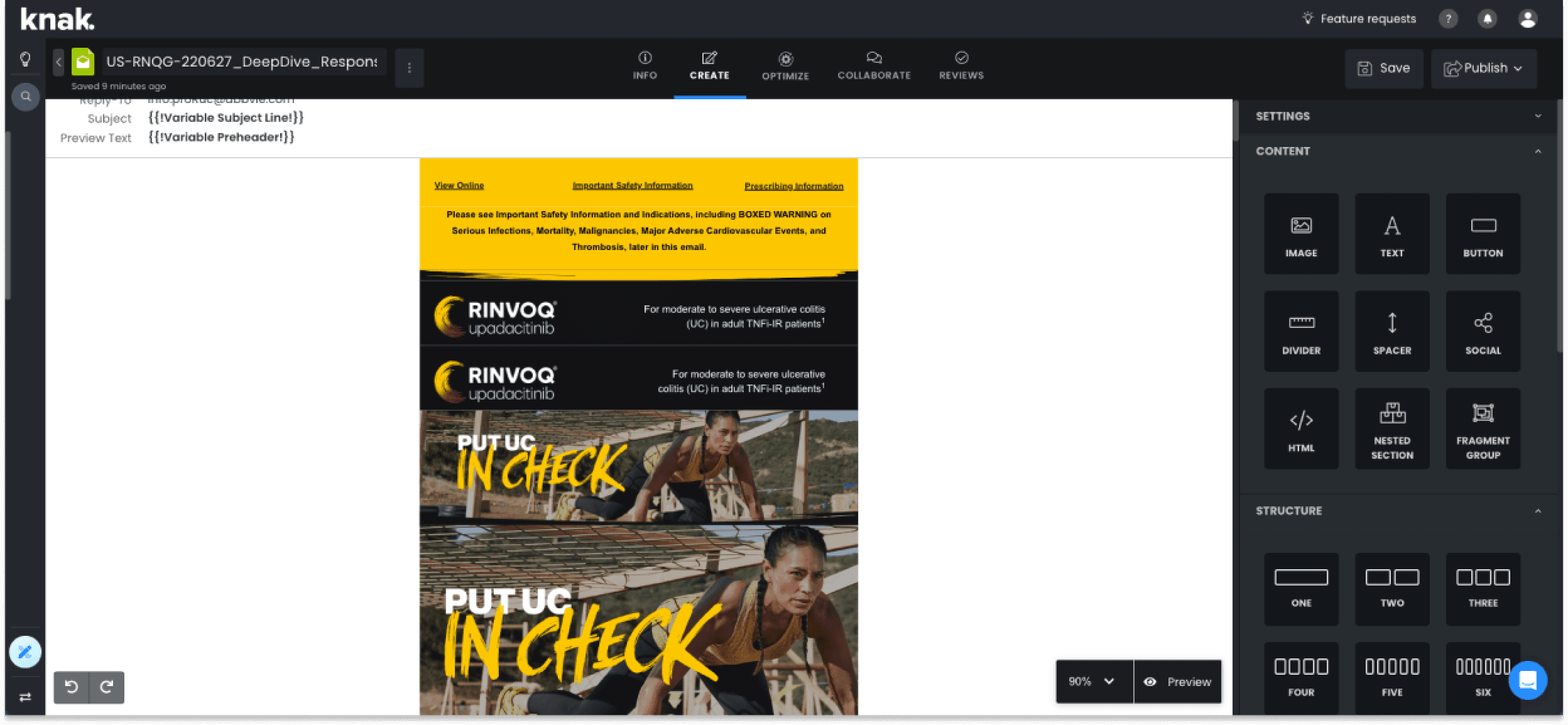 Using similar best practices that we would in FIGMA, we are able to closely mirror our process outside the platform, however here we are able to immediately view desktop and mobile states. This allows us to quickly trouble shoot any issues before it goes through QA process. Knak effectively slashes hours when it comes to build, development and review, allowing for a significantly expedited email process.