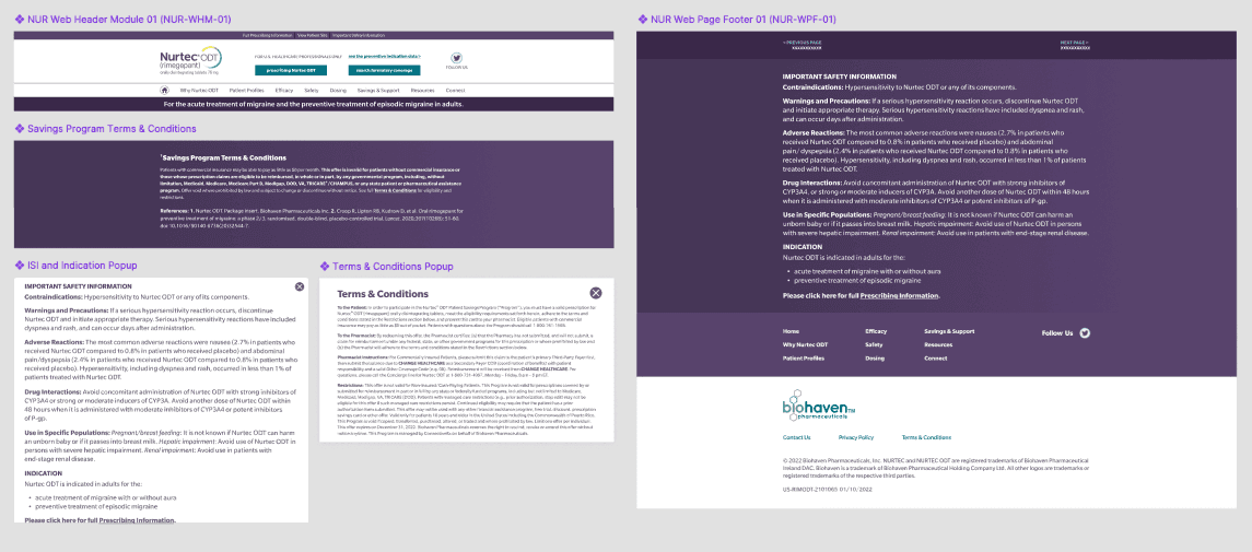 To remedy this issue and save time, I built out several components that the entire cross functional team could leverage. Medical Legal team would only have to mark up the component once, and have confidence that the changes would be reflective across all pages significant reducing stress and resourcing on their part. Introducing this tiny workflow shift greatly improved effiency across the entire process, easing the burden and timing of edits.