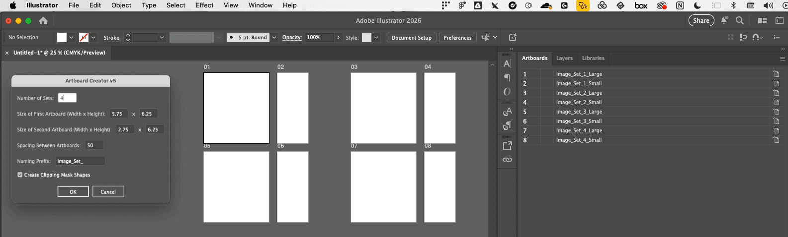 For the postcards, two Illustrator scripts were built to handle image preparation. The first, Artboard Creator, generates custom-sized pairs of artboards for each postcard set. Separating artboard creation from image placement reduced the processing load on Illustrator and made the setup step faster.