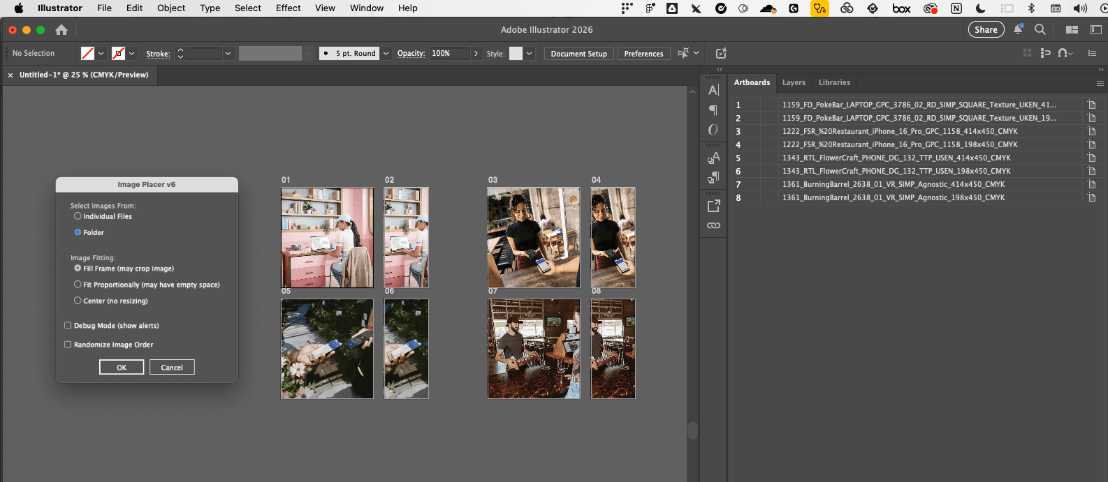 The second script, Image Placer, lets a user select individual images or an entire folder and flow them into prepared artboards, adjusting naming conventions ready for delivery. Both scripts were built to allow composition adjustments without needing production support for each job.