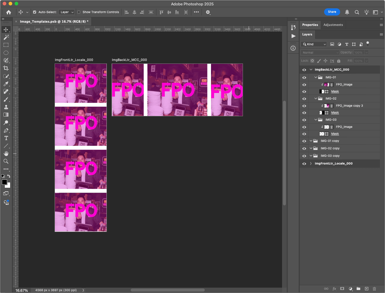 The letters contained seven images per set, each needing to be delivered as a single locked-up file for the print vendor. A Photoshop frame template using a mask system was built to handle this. Images could be linked in, compositions adjusted, and final exports produced in batch rather than one at a time.