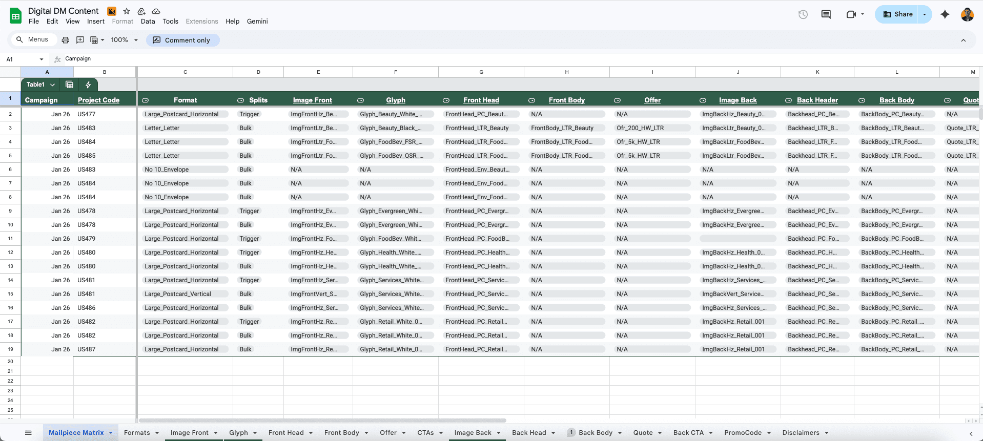 With the mechanical templates and image workflows in place, a master Google Sheet was built to house all the variations and elements for every job. The print vendor had a single source of truth for copy, image references, and output specs, and jobs could be processed against a pre-agreed framework without requiring a production contact on every round.